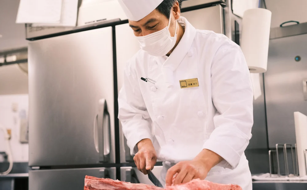 そんな特別な空間を演出しているのは、内装や家具だけではありません。お客様をお迎えするのは、コックコートを着用したシェフたち。「ローストビーフの店鎌倉山」のシェフたちは、キッチンでの調理はもちろん、店内のサービス、店の掃除に至るまですべてこなしているそうです。自分が作った料理を、自らお客様にご提供することが当たり前。まさに、ここは、料理人がもてなすレストランなのです。