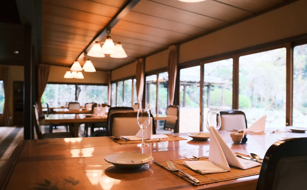 「静かな住宅地の中にあって、ゆったりした空間で、田舎に遊びに来たような雰囲気でしょう」と渡邊さん。窓から見渡せる美しい庭園と、どこか懐かしくラグジュアリーな雰囲気の内装や家具。まるで小旅行に来たような気分が味わえます。席の間隔もゆったりと広くとられているので、隣席を気にすることなく安心して食事を楽しむことができます。
