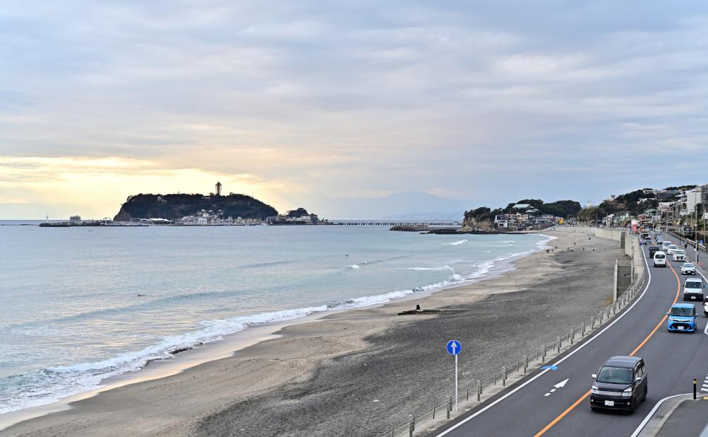海岸線に沿ってゆるやかなカーブを描く道路、そのすぐ脇を走るレトロな江ノ電。海に目をやれば、ゆるい波とたわむれるサーファーたちと愛らしいフォルムの江ノ島が見え、スッキリと晴れた日は遠くに富士山がその姿を現す……。神奈川県鎌倉市の七里ヶ浜は、景観が美しい海岸として「日本の渚百選」にも選ばれている場所です。