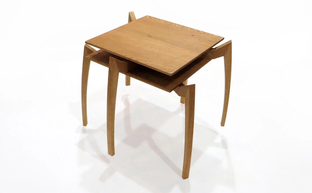 清水さんのつくる家具は、ユニークな発想にあふれています。例えばこの、動物の脚がついたようなデザインの家具は、横につなげたり重ねたりできる対のローテーブル。声をかけたらそばに駆けつけてくれそうです。「家具を擬人化するのが好きで、このような脚がついた家具は照明やテーブルなどほかにも制作しています」と清水さん。