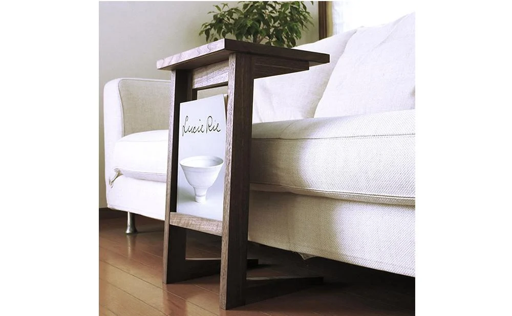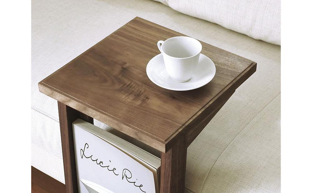 「脚がソファの下にグッと入るので、ソファに座ったときにテーブルがちょうどよく身体の横に来るようになっています。フロントには本や雑誌を一冊置けるようになっていて、お部屋のちょっとしたアクセントにできるのがポイント。テーブルの脚が少し斜めになっているのは、本を安定して置けるようにするのと、立ち上がって見たときに本の表紙を見やすくするためです」