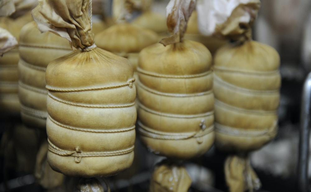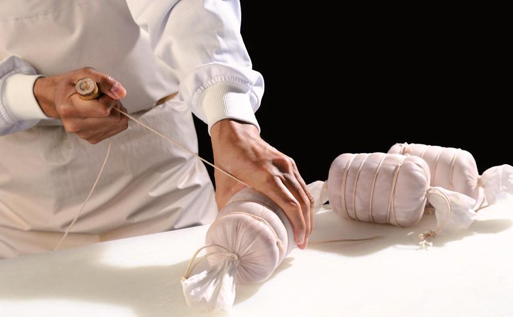 そして工程の中で最も熟練の技が必要となるのが「布巻き」です。漬け込んだ肉を布で巻いていくのですが、この「包み」の作業が何より難しいのだとか。「ひとつひとつ形状の違う肉の個体からハムの完成形を瞬時に見極めて、上下左右に圧を加えて成形するのがこの工程です。巻いたあとに布から水が浮き出るくらいしっかり巻くのがとても難しい。できるようになるまで早くても5年くらいかかります」(望月さん)