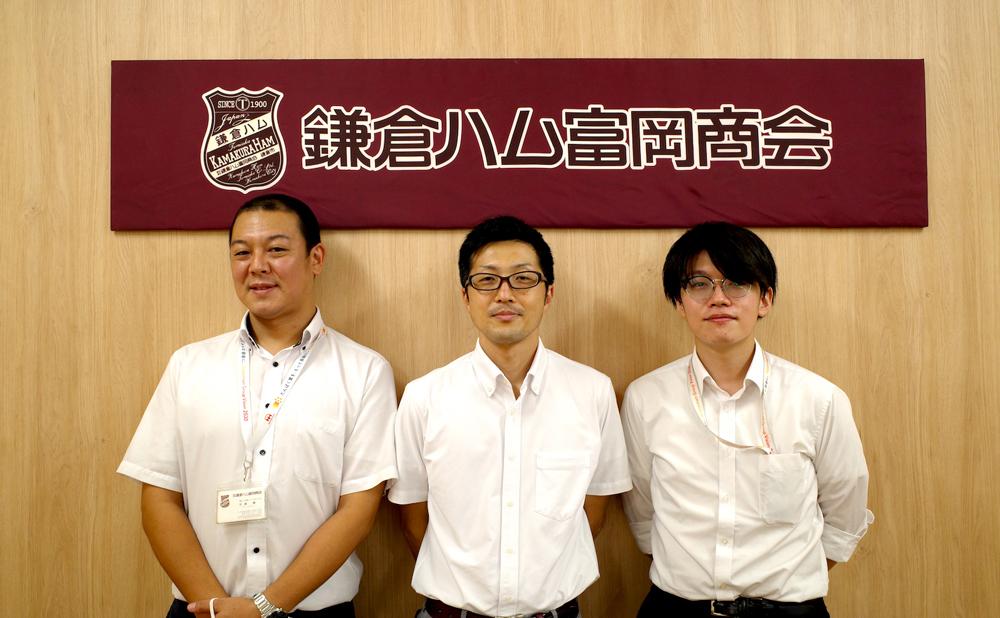 そんな歴史ある鎌倉ハム富岡商会の哲学の結晶ともいえるのが、返礼品の「熟成布巻きロースハム」。今回、このハムの伝統の製法について伺うべく「鎌倉ハム富岡商会 鎌倉工場店」に向かいました。案内してくれたのは、こちらの3名。左が営業の安藤慶さん、右が古泉智章さん、そして中央がハム職人の生産部・望月岳人さんです。