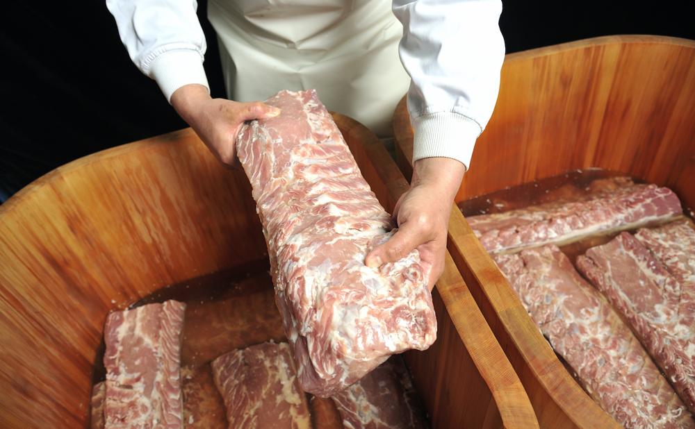 続いて行うのが「漬け込み」。豚肉は味付けのため、木樽に入れられ、塩漬液に漬けられます。この液の配合や濃度は会社の「秘中の秘」といわれる機密事項。「漬け込んだあとは、上下の肉を入れ替える『手返し』の作業を毎日行います」(望月さん)