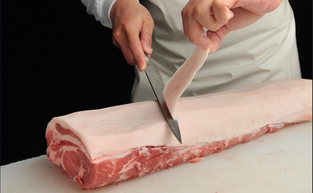 布巻きロースハムは、厳選された国産豚を使用し、磨き・漬け込み・布巻き・燻煙という作業を経てつくられます。すべての工程を終えるまでにかかる時間は約2週間。1日につくれるのは200個程度だそうです。「まず最初に行うのが、『磨き』という作業。豚肉の塊から、スジや軟骨、多すぎる脂肪など余分なものを削いでいきます。これにより、赤身と脂肪のバランスがいいハムの基をつくります」と望月さん。豚肉を美しく磨く所作はまるで彫刻のよう! それぞれ別の命、個体を扱うからこそ、丁寧に作業していきます。
